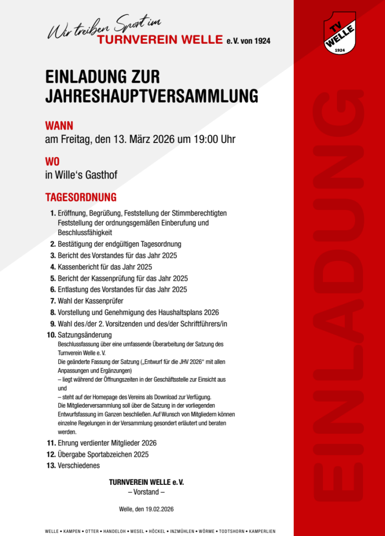 Die diesjährige Hauptversammlung findet am Freitag, den 13.03.2026 in Wille’s Gasthof in Welle statt. Einladung: https://tv-welle.de/wp-content/uploads/2026/02/Einladung-_JHV_2026.pdf Zu Tagesordnungspunkt 10:Grundsätzlich wollen wir über die nachstehend beigefügte